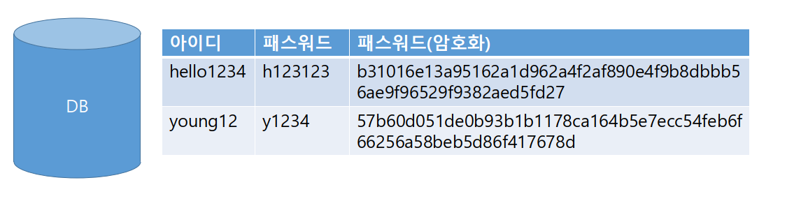 - 가장 대표적으로 사용하는 곳은 비밀번호를 저장할 때, 암호화해서 저장하면 탈취를 당해도 기존 비밀번호를 쉽게 알 수 없어 보안에 효과적임.